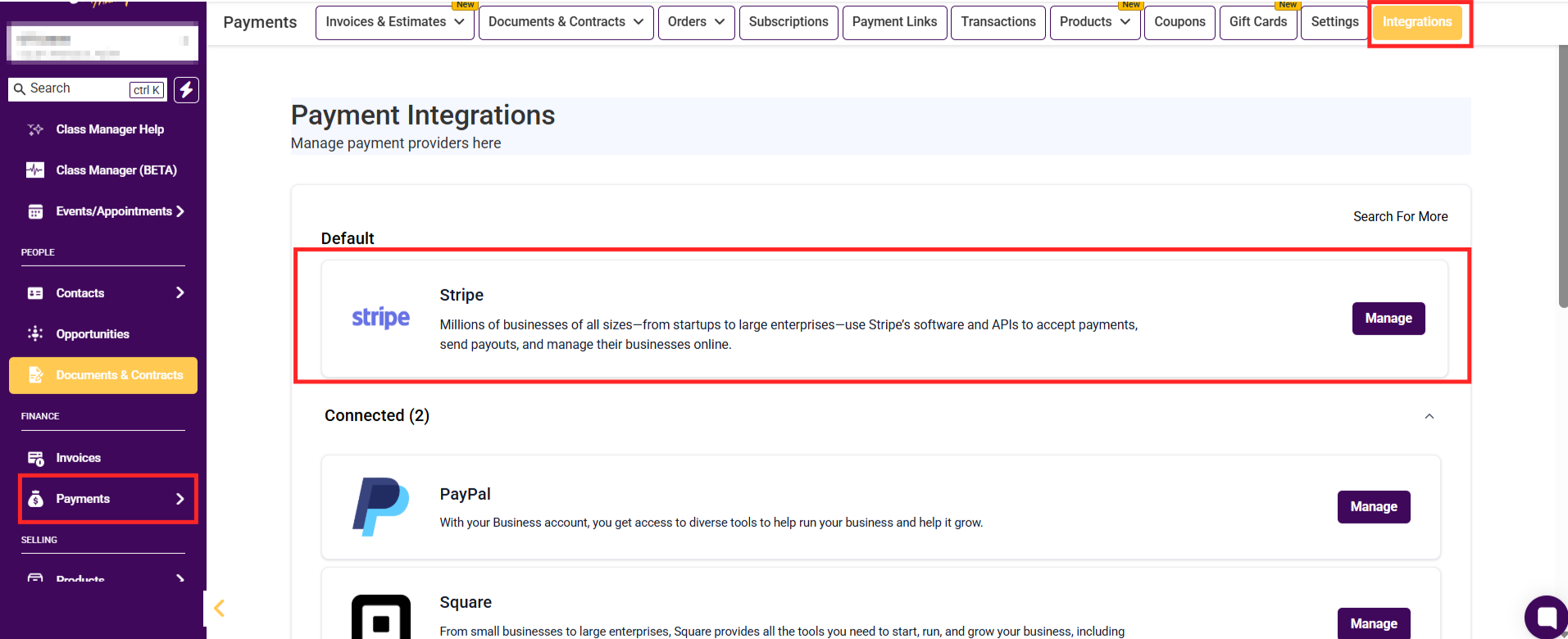 To receive payments and use Quick Payment Links, make sure your Stripe account is connected, to do this go to the Payments tab, then Integrations.