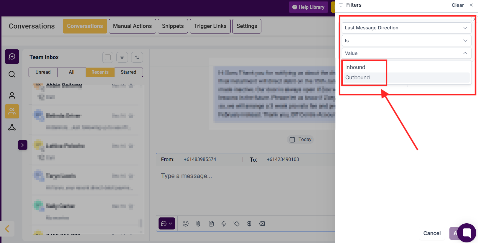 Outbound: The Outbound filter will show all of the latest messages that have gone out of your CRM on any messaging channel.