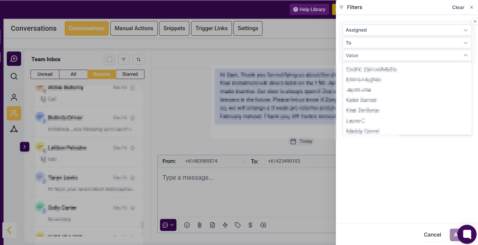 Assigned To: You can view messages assigned to specific team members by clicking the Assigned To button. Once you do, you will see a dropdown list of your team members. Click on one or more team members, then click Apply to view the conversations assigned to them.