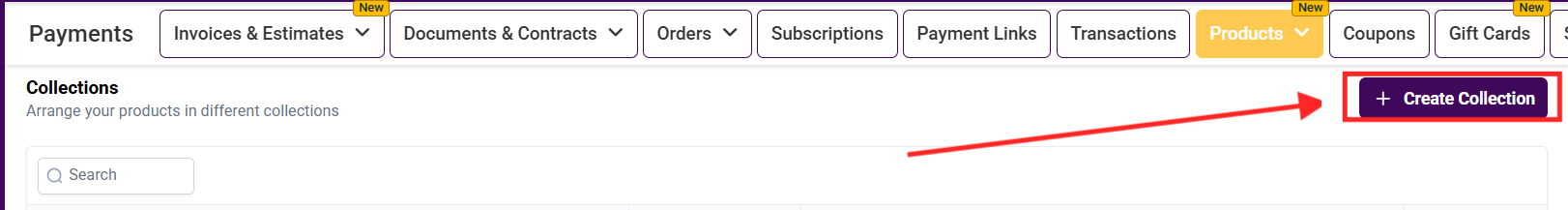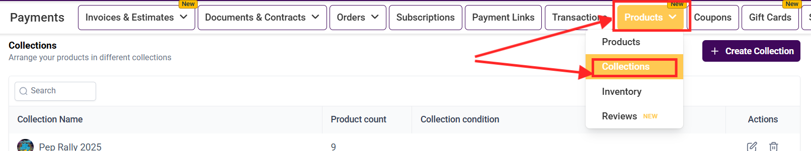 To create them select the Collections option inside the Products Tab. This will be under the Payments section.