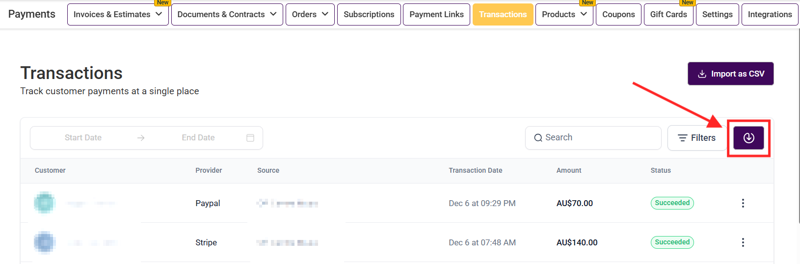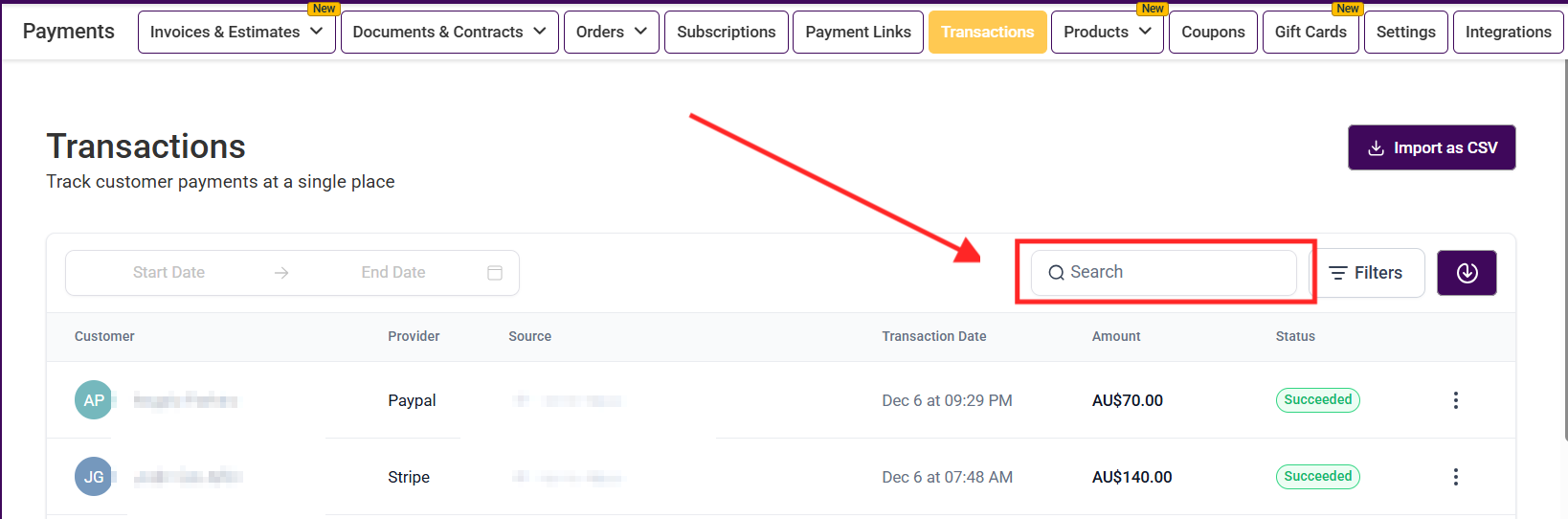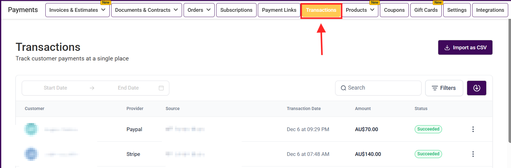 Navigate to the Payments tab, then select the Transactions option to begin.