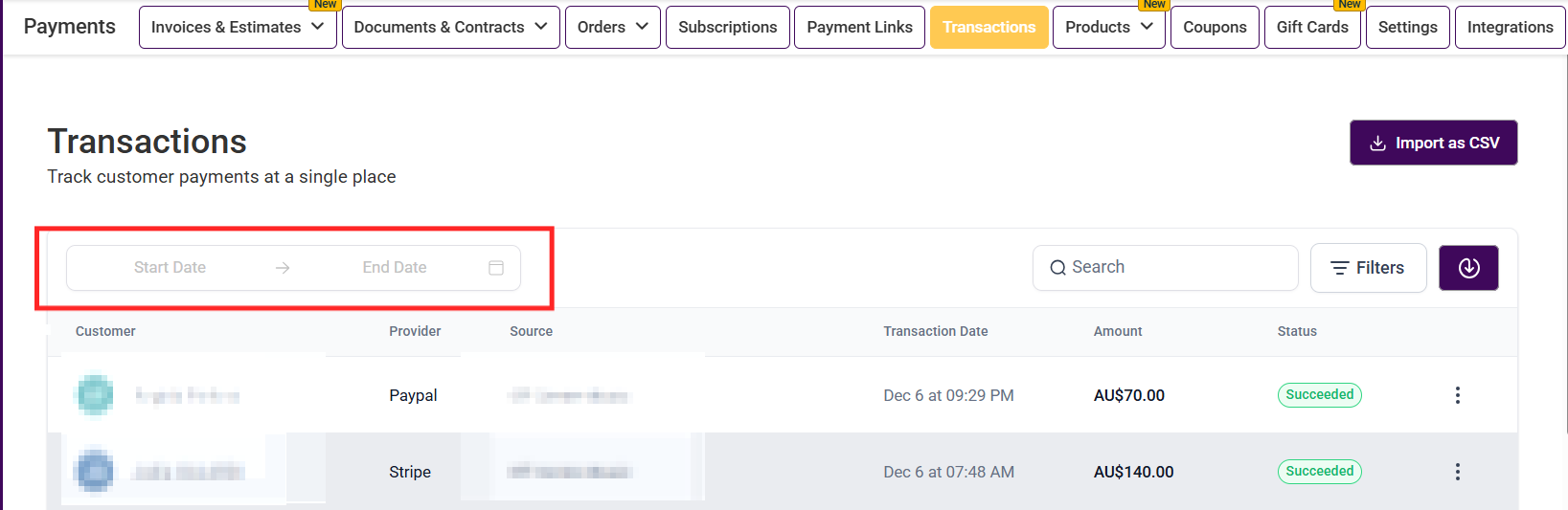 The Transactions tab within the Payments section provides a centralised location to review all sales processed through the various tools available on your platform. This feature offers detailed visibility into each transaction, including dates, amounts, and the associated customer details. Whether the sales originate from invoices, payment links, or integrations like Apple Pay, Google Pay, or Stripe, the Transactions tab consolidates this data for easy access and management.