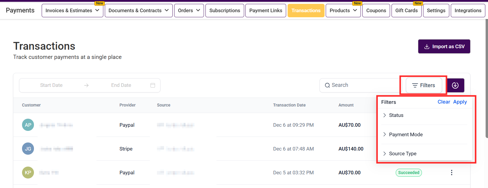 Apply Status, Payment Mode, or Source Type filters to view transactions that satisfy specific criteria.