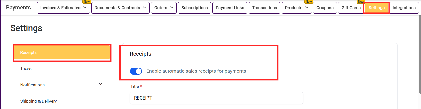 Enabling Automatic Receipts is simple. Access the Settings page under the Payments menu, navigate to the Receipts section, and turn the toggle on to enable automatic receipts.