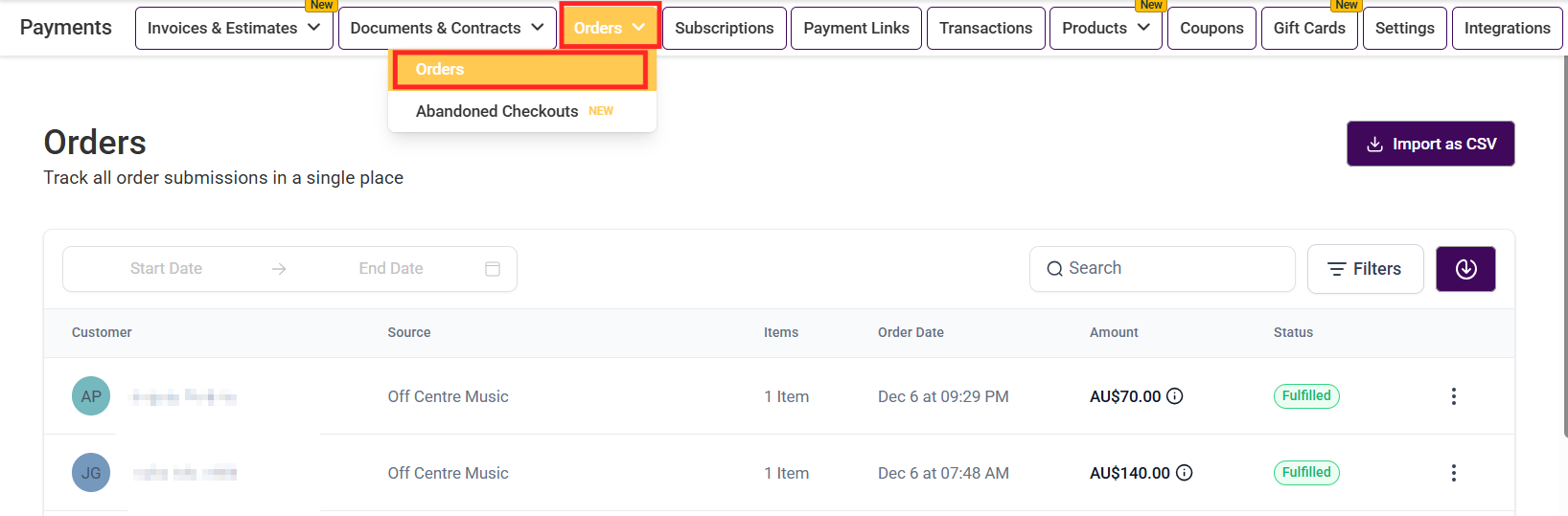Navigate to the Orders tab inside your Payments section, in the Orders dropdown, click on Orders.