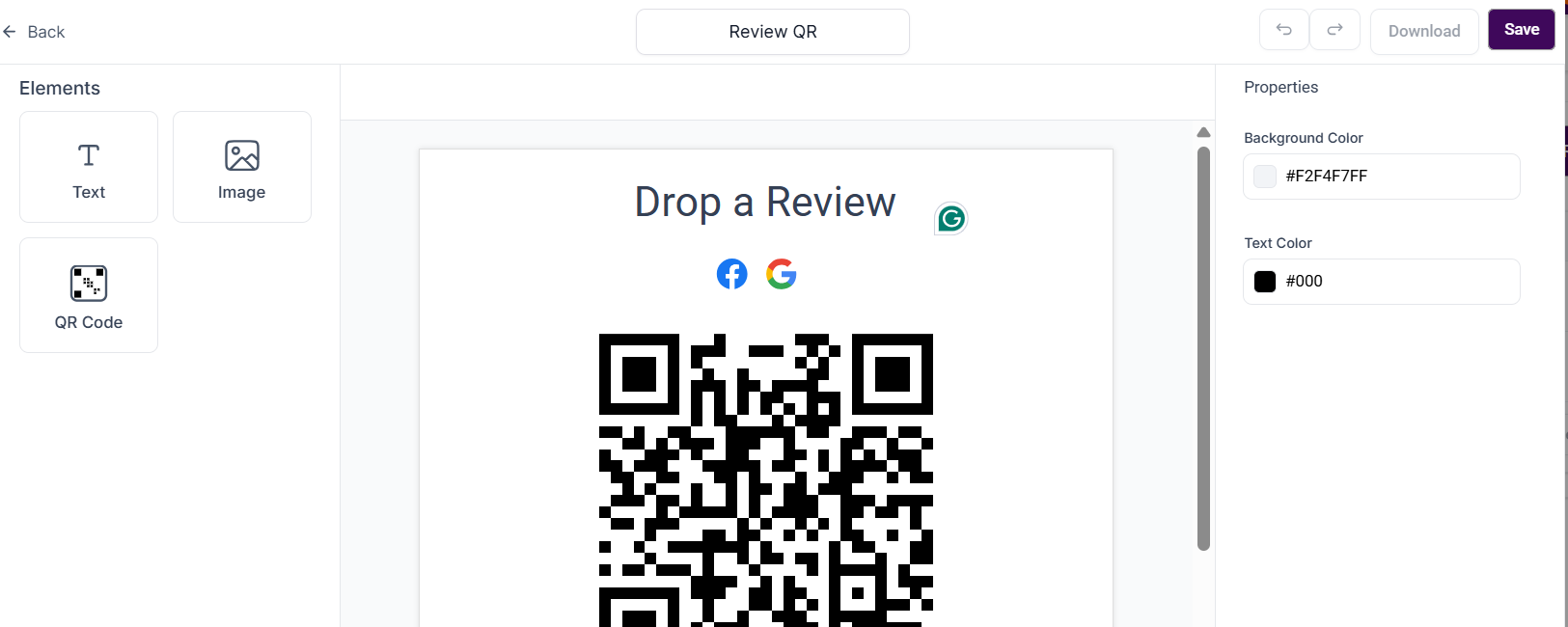 Users can create a QR code of their choice by changing the color,text and footer of the QR Code and than can also review the edit.