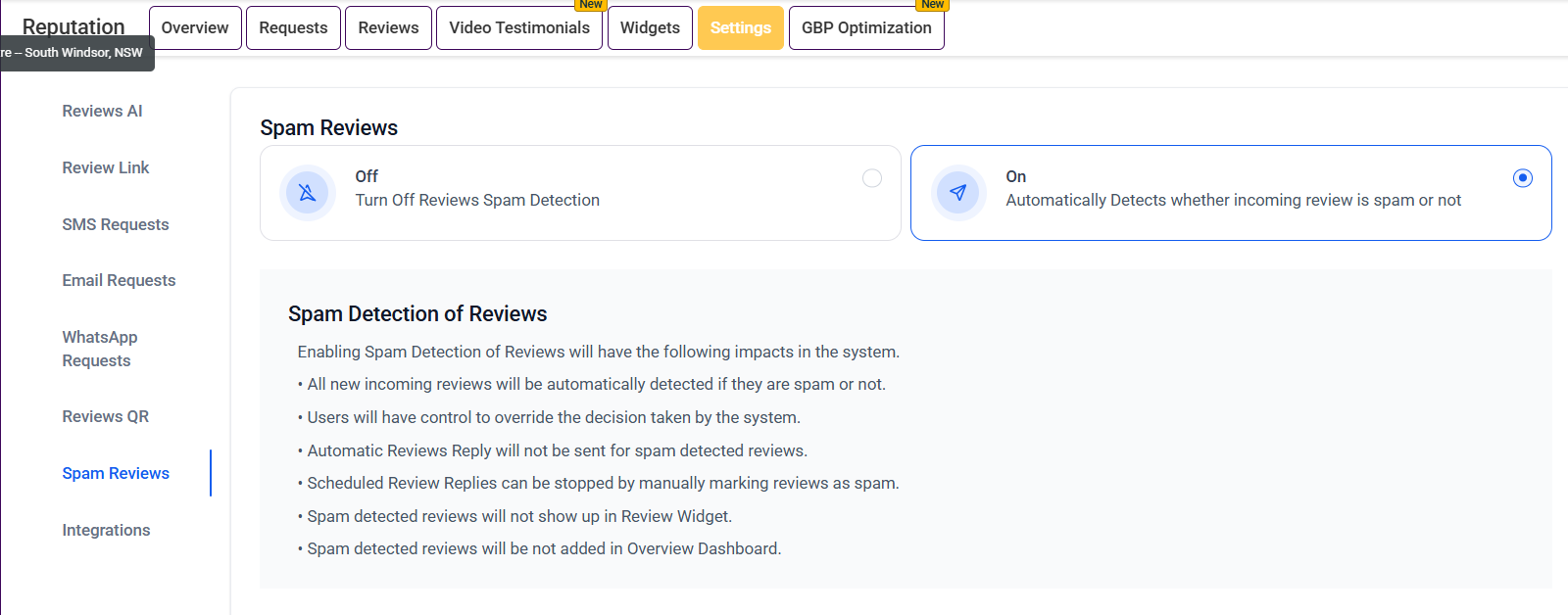 Toggle the Spam Reviews feature on or off as needed. The Smart Spam Detection system provides advanced protection and control over flagged content.