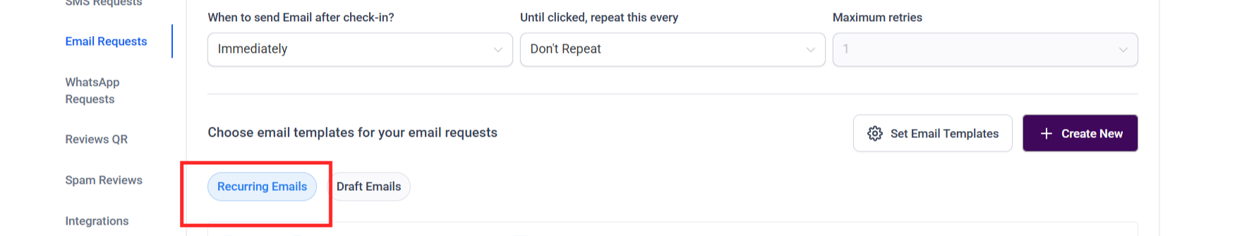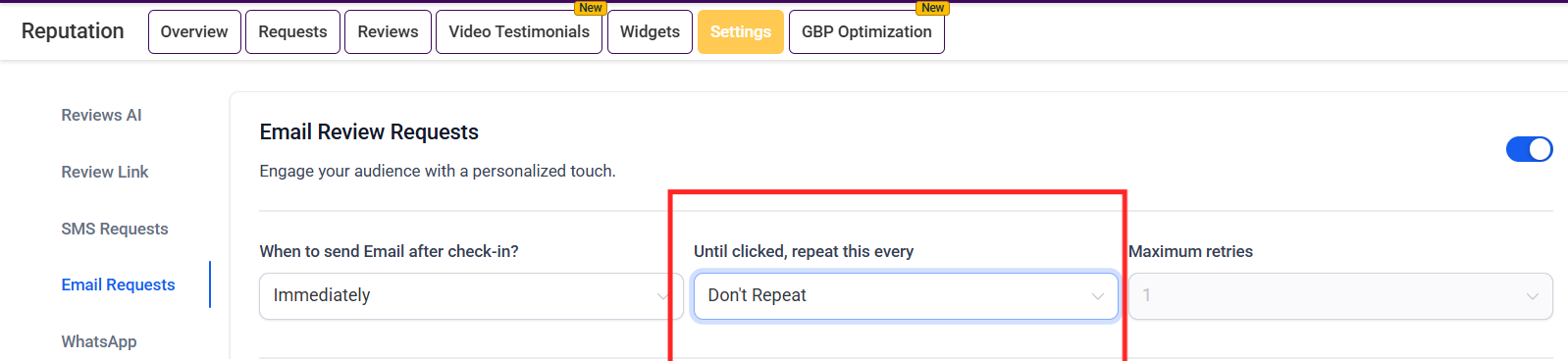 The behavior of review requests can be customized based on user preference. Users can choose between sending review requests instantly and just once or scheduling them based on their needs.