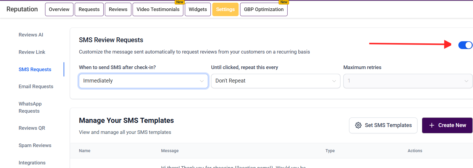 In the SMS Review Requests section, users can modify their review request SMS to better align with their company's messaging, also can change the template. To activate custom SMS messages, users can toggle the switch.