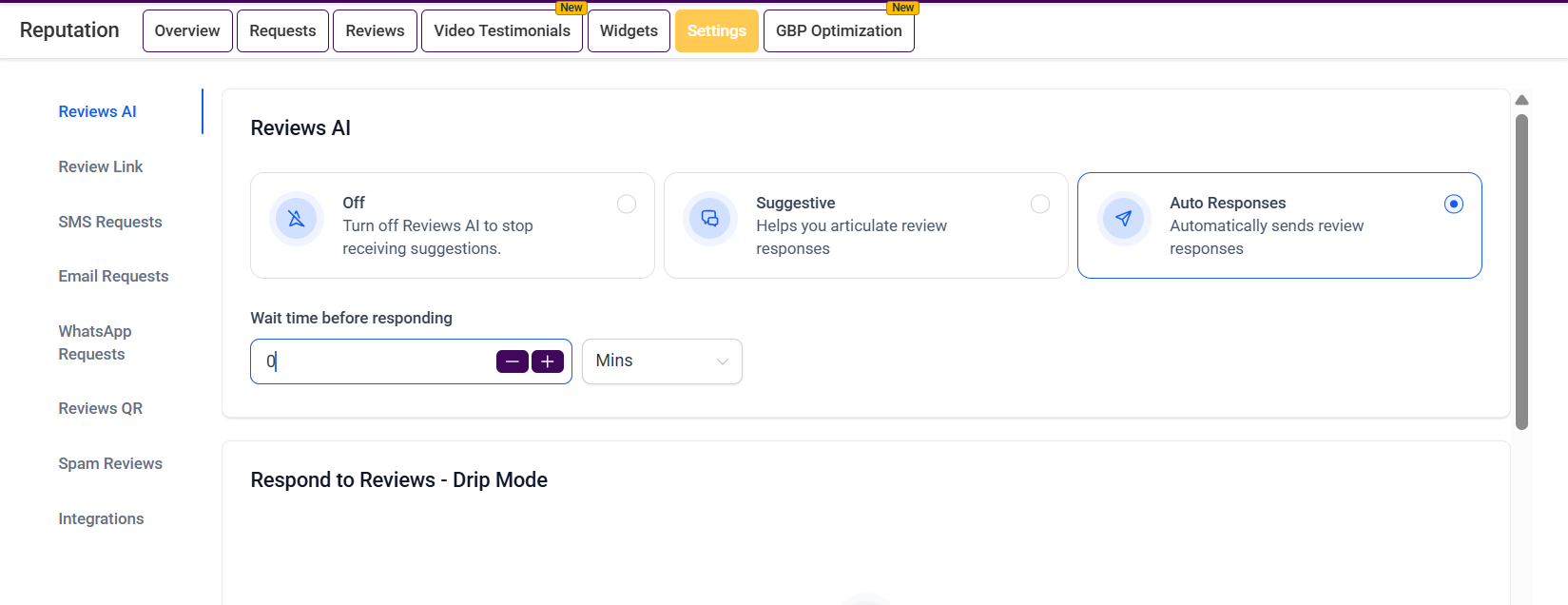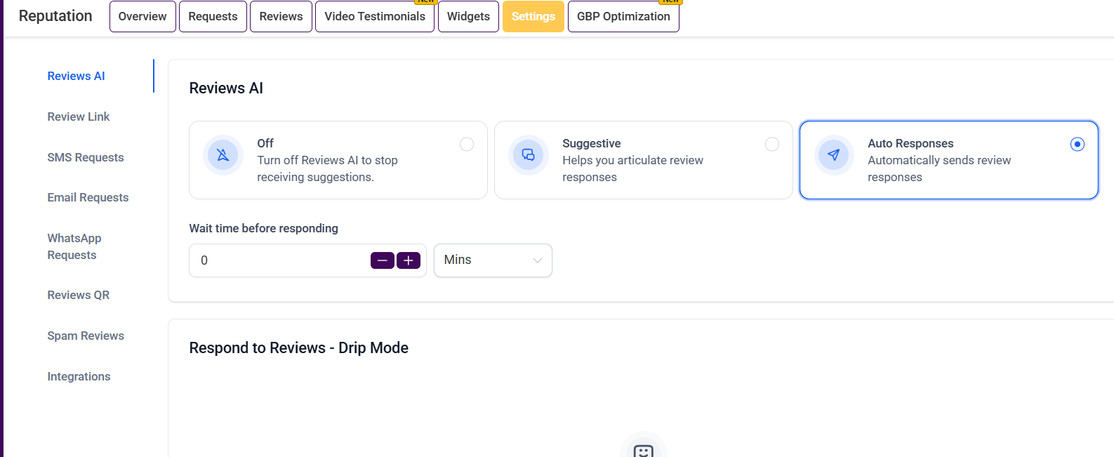 This is where to configure the settings for the Automated responses including which reviews to respond to, the time for the responses, and the footer to include.