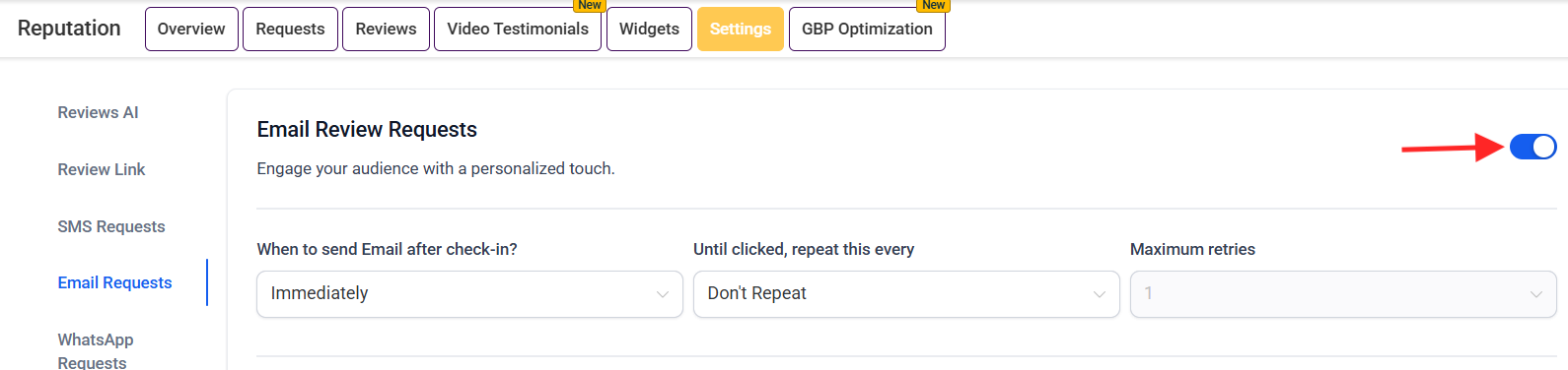 In the Email Review Requests section, users can modify their review request SMS to better align with their company's messaging. To activate custom email, users can toggle the switch.