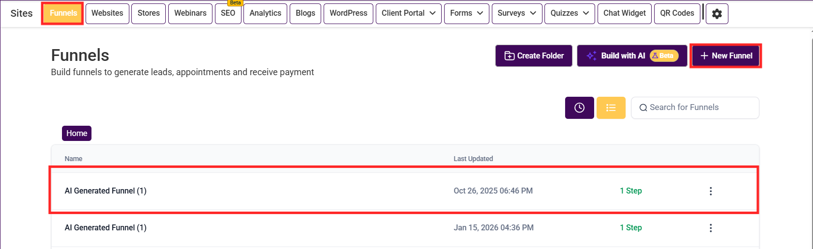 Go to the "Sites" section from the dashboard. Choose between creating a new funnel or editing an existing one.