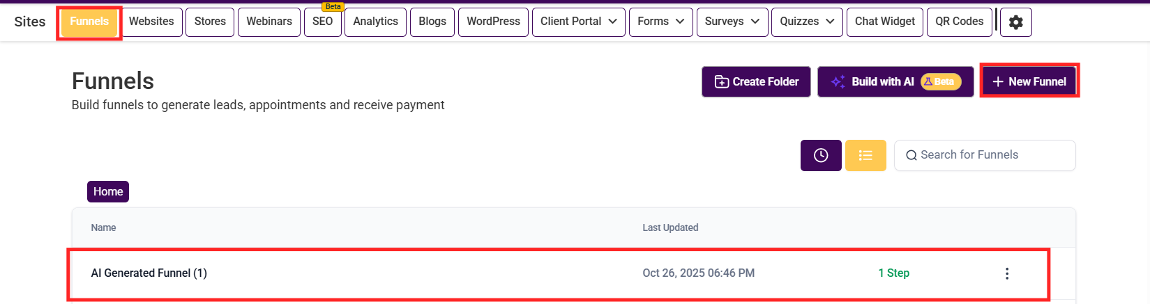 Navigate to the Sites tab and select "Funnel."