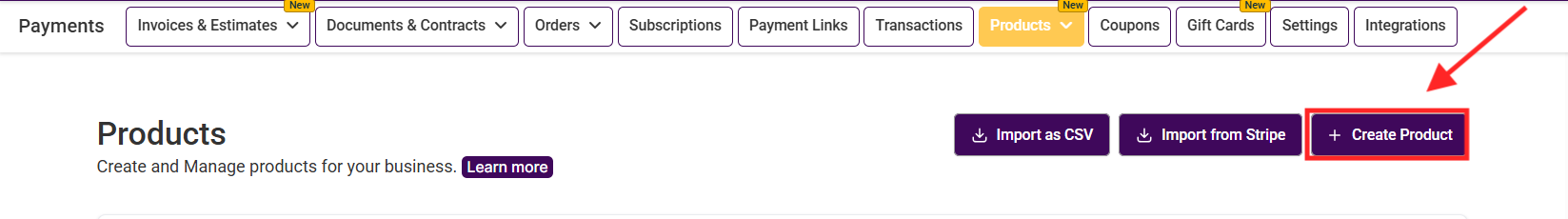 Go to the Products tab in the Payments section.