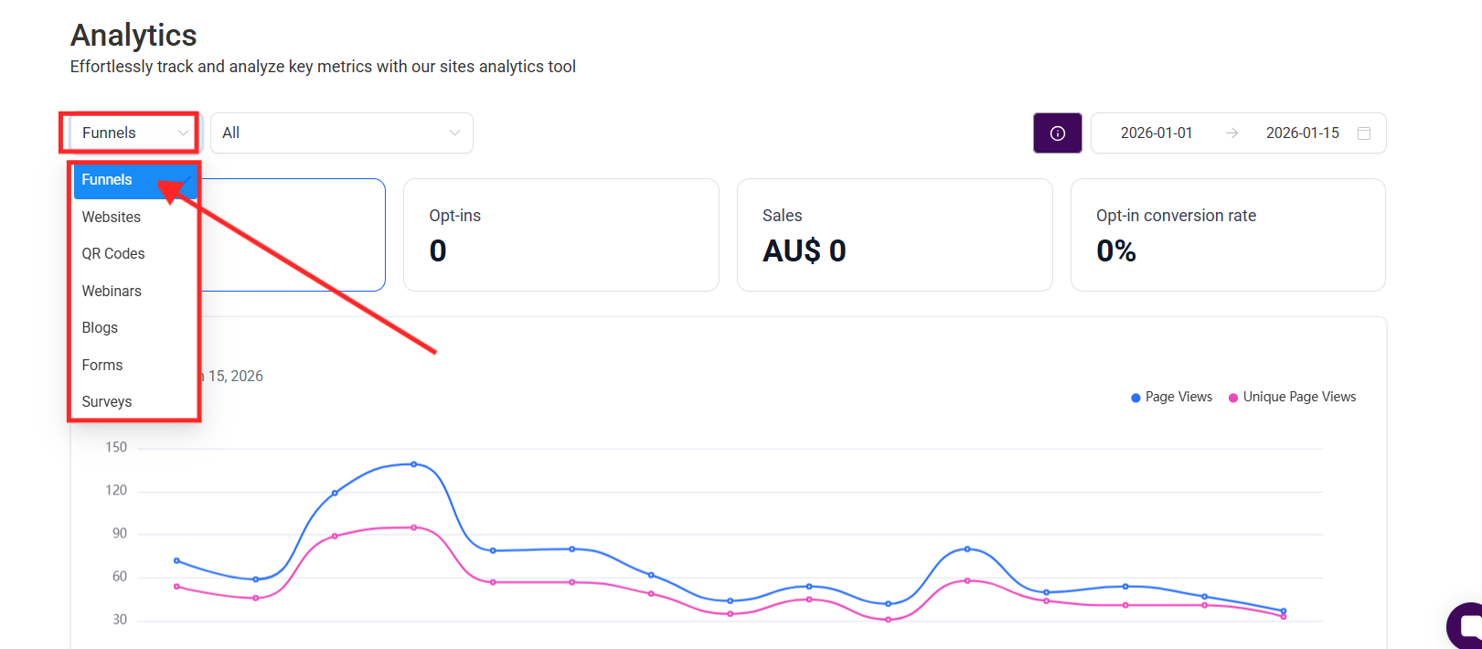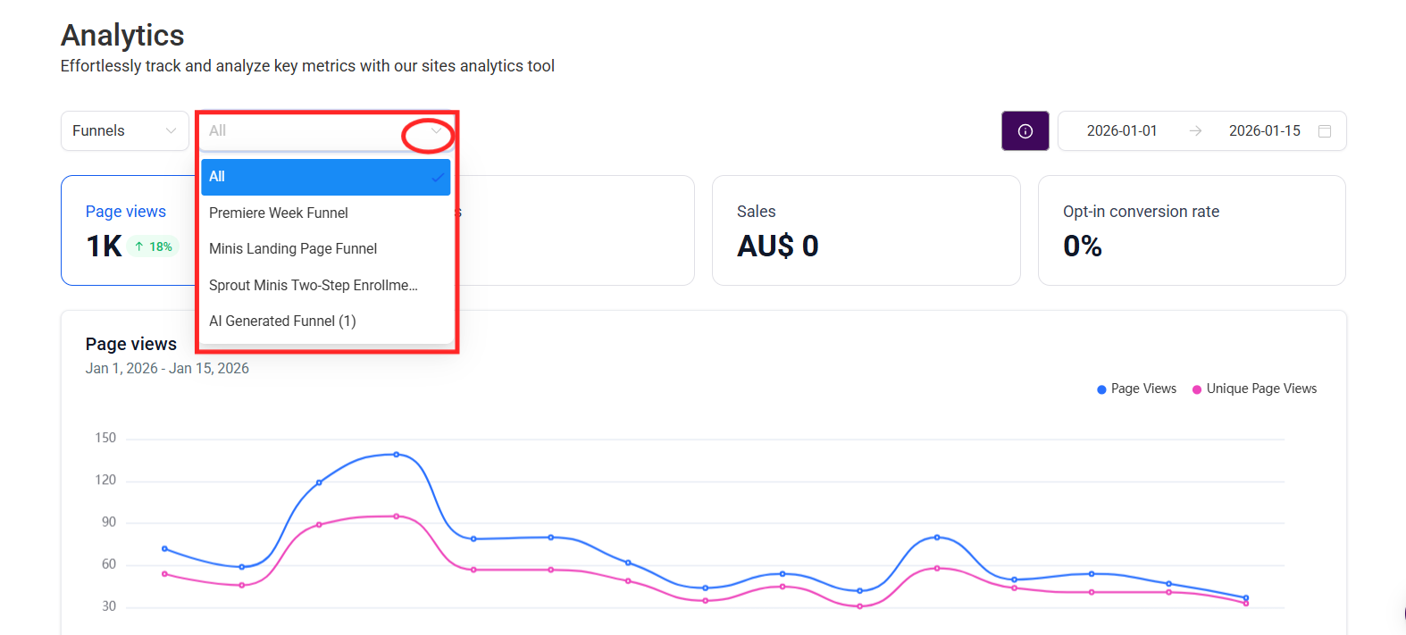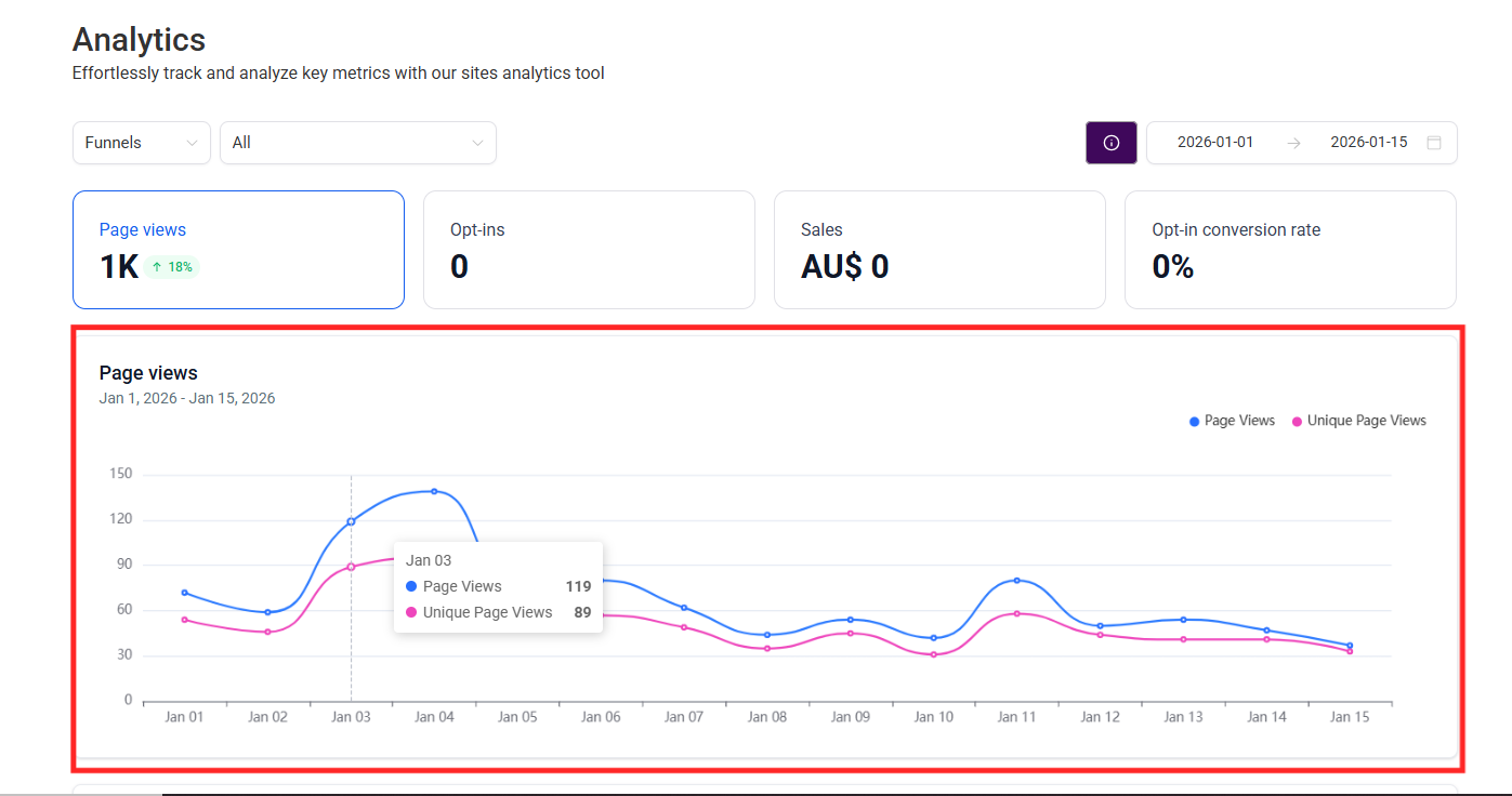 Page Views: You can see how many times your funnel/website was visited. You can also see data on unique page views.