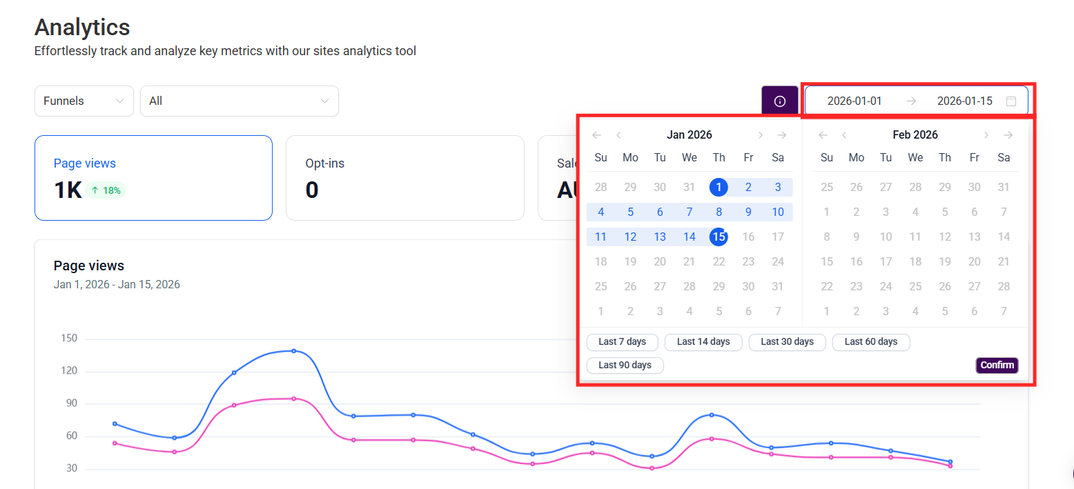 Select a date range with the date picker to view analytics within your chosen time frame.