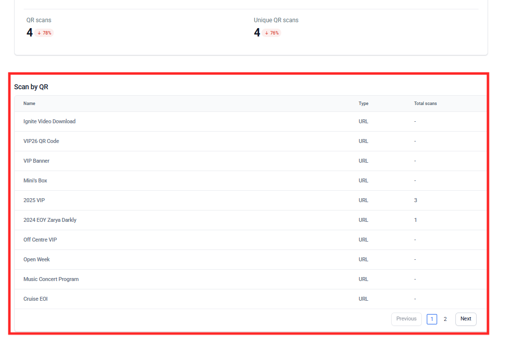 View the total number of QR code scans and the count of unique scans in the graph displayed for the selected time frame.