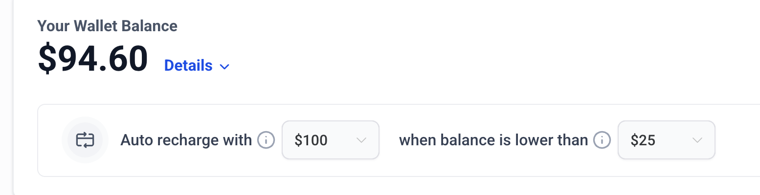 If you see a $10 or $20 USD charge, it’s likely an automatic credit top-up triggered when your balance ran low. You can also change the auto topup amount and when it happens. For example in the example above, once the balance gets below $25USD it will automatically recharge with $100USD which appears as an additional charge on your credit card statement.