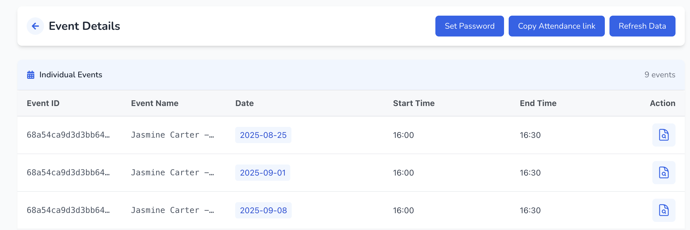 Click the Attendance icon in the Action column for a session.