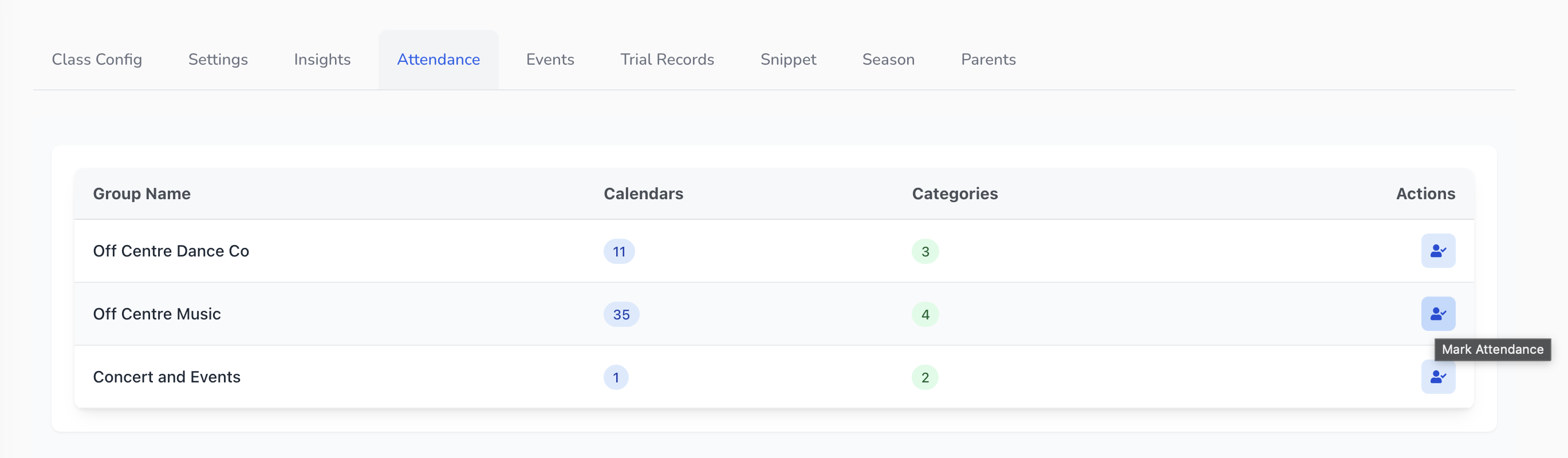 A table shows each group with the number of calendars and categories. Click the blue attendance icon (A person with a tick) next to the group you are looking for.