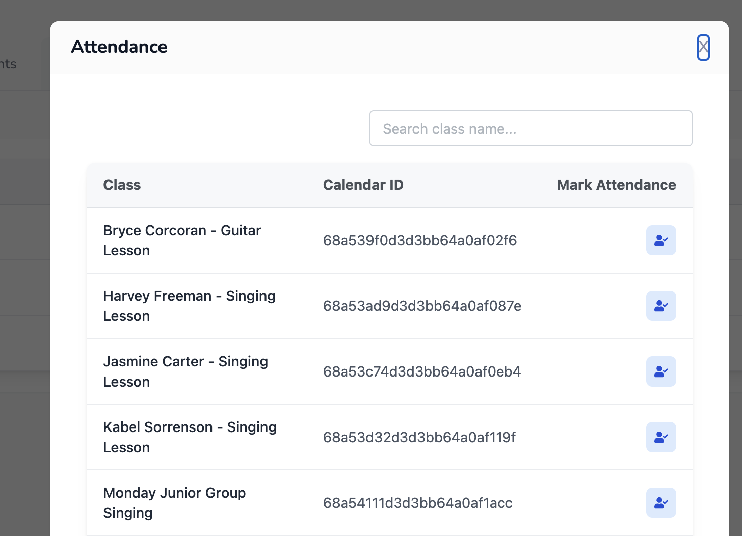 Note: In the current beta version, events may only populate on the day they occur. You might not be able to mark attendance in advance. Ensure you refresh the event list on or after the class date.