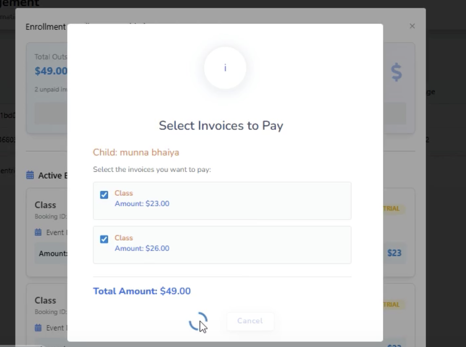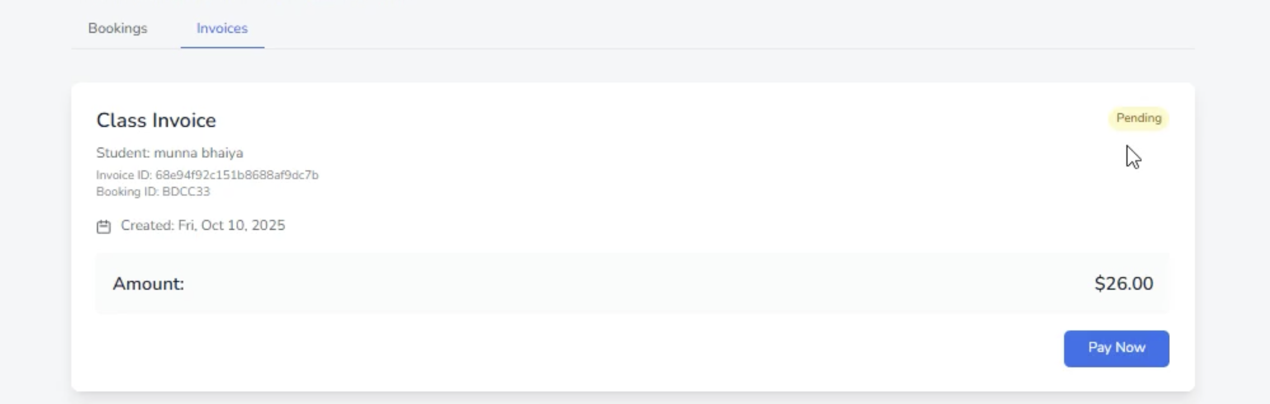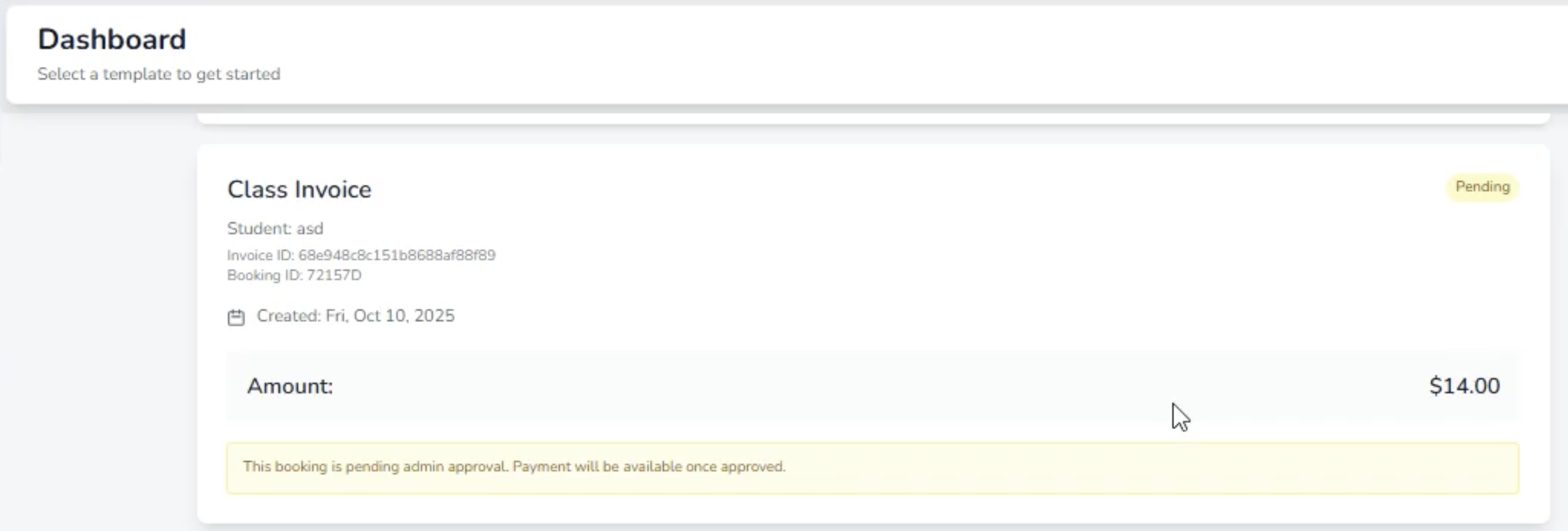 If a class enrolment has not been confirmed by the studio admin, the customer will see a PENDING status on their class charges.