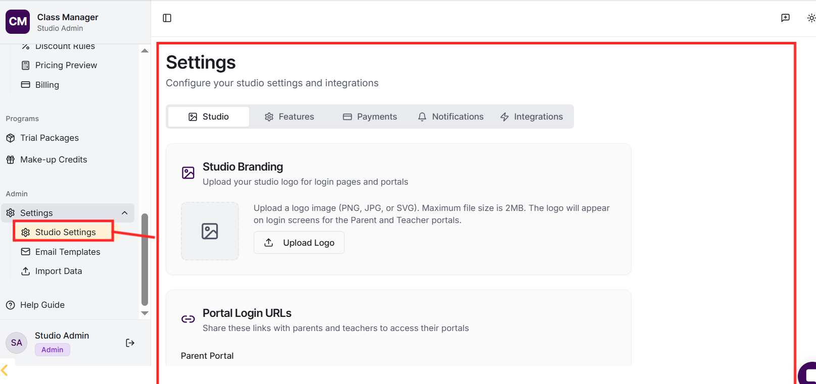 Admin Portal (full access to all studio features including settings, pricing, and user management),