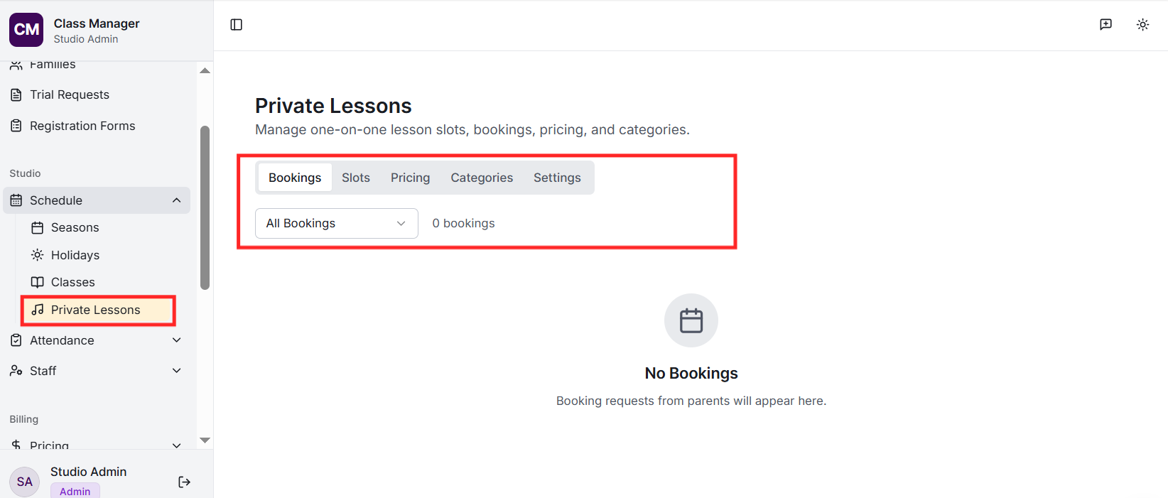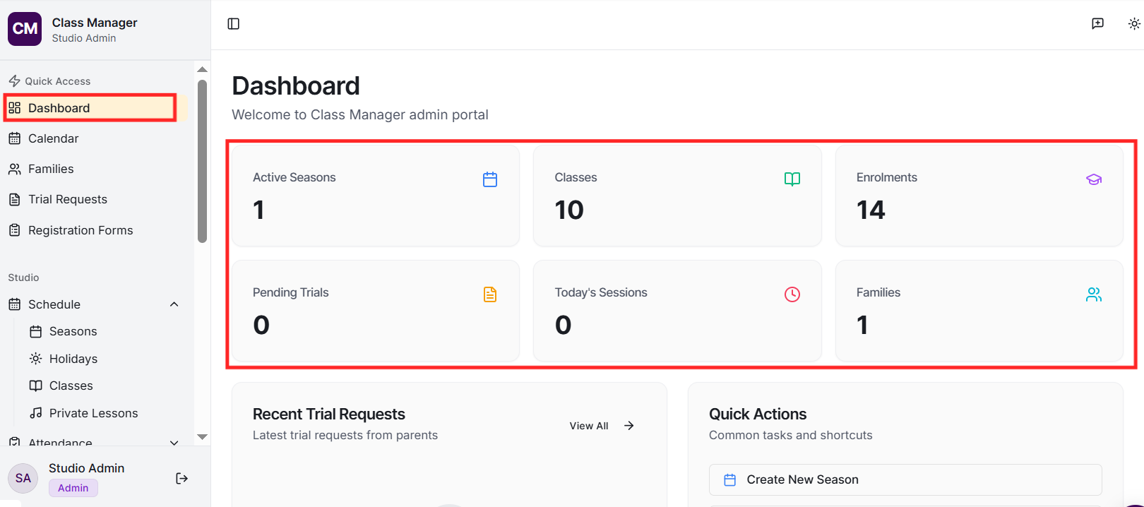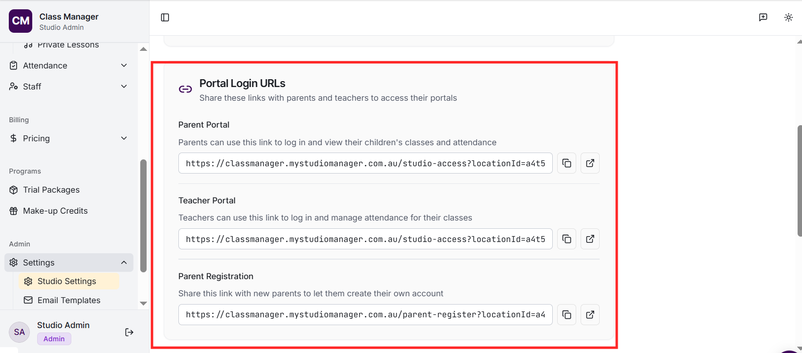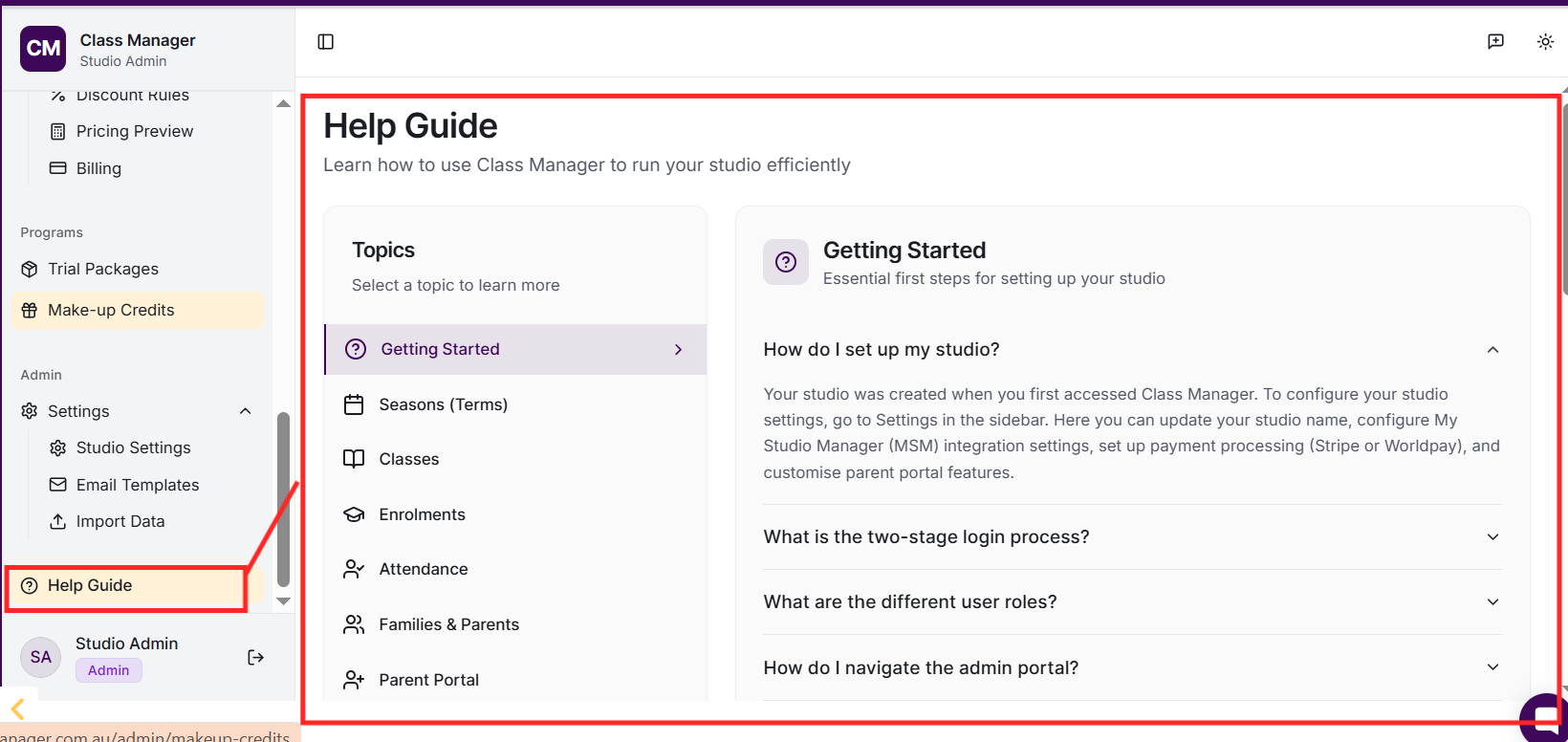 Your studio was created when you first accessed Class Manager. To configure your studio settings, go to Settings in the sidebar. Here you can update your studio name, configure My Studio Manager (MSM) integration settings, set up payment processing (Stripe or Worldpay), and customise parent portal features.