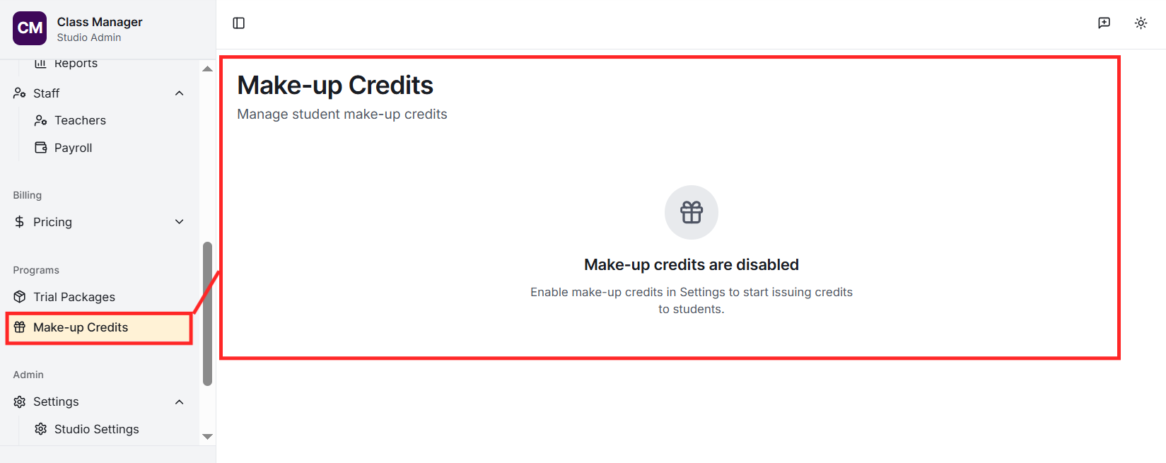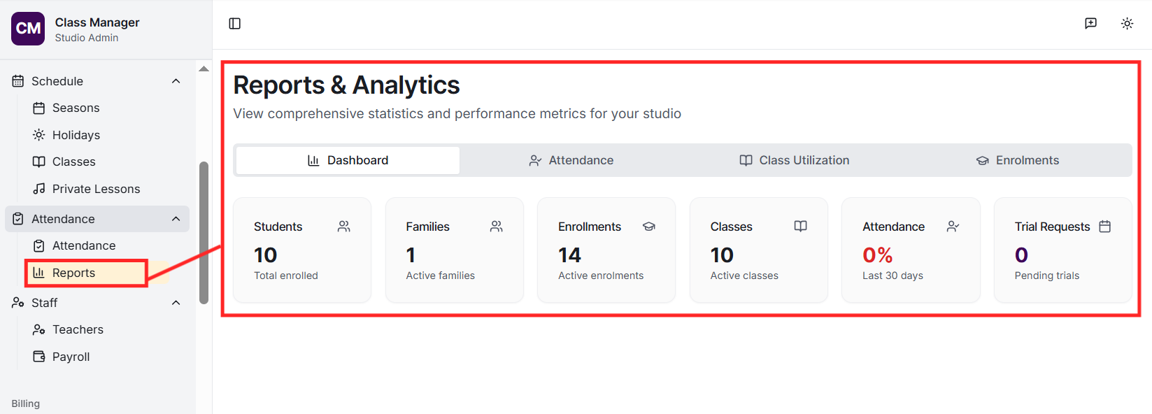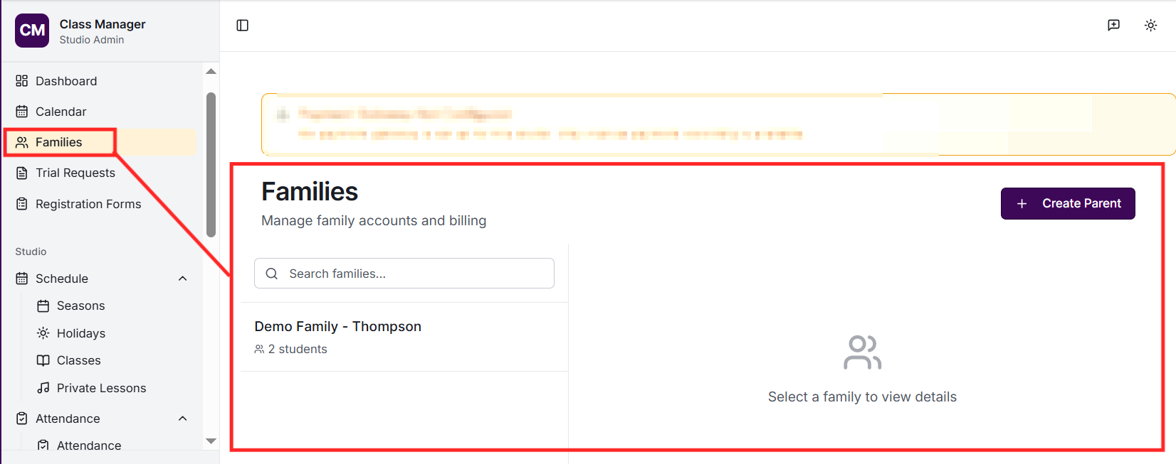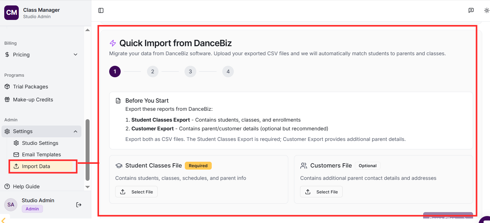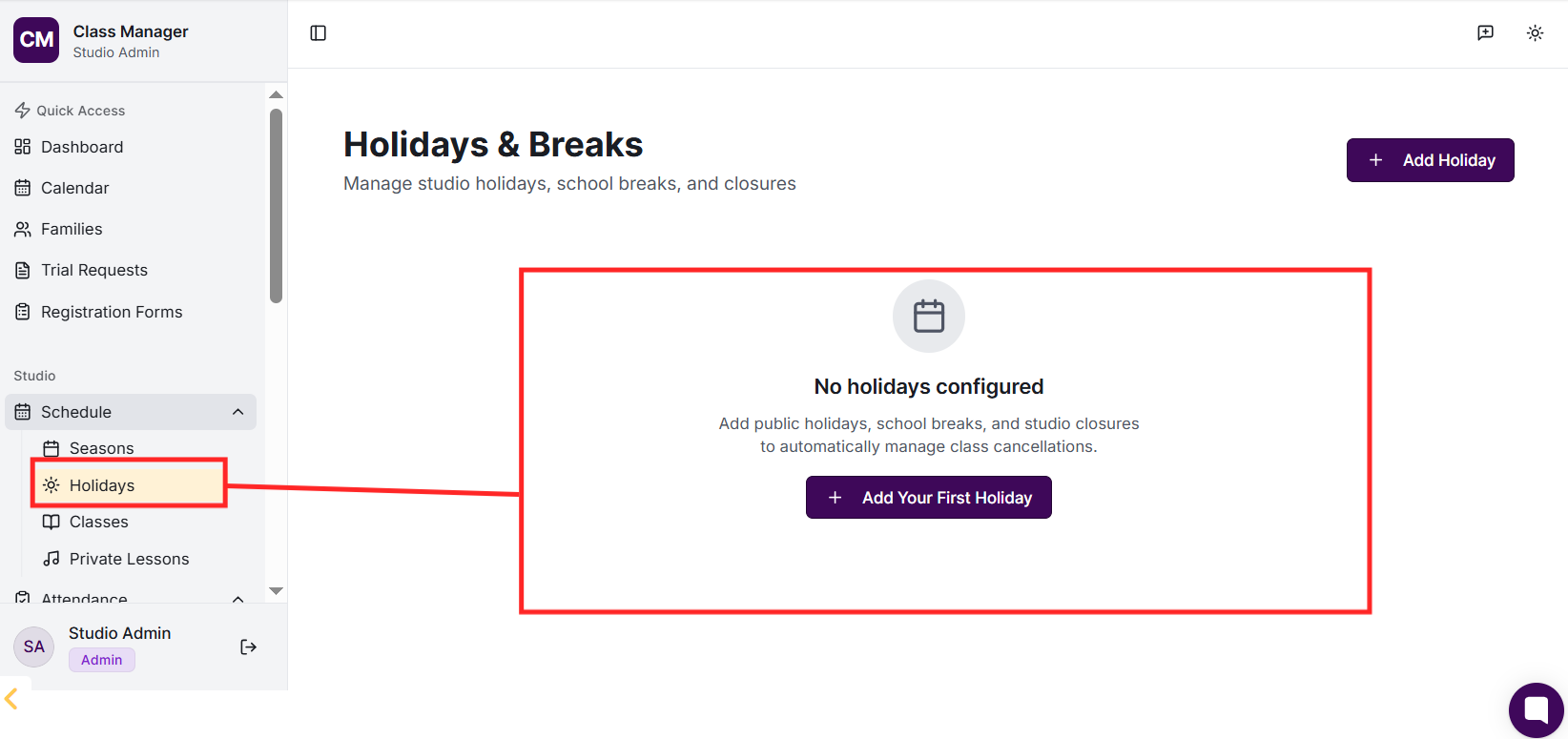 Your studio was created when you first accessed Class Manager. To configure your studio settings, go to Settings in the sidebar. Here you can update your studio name, configure My Studio Manager (MSM) integration settings, set up payment processing (Stripe or Worldpay), and customise parent portal features.