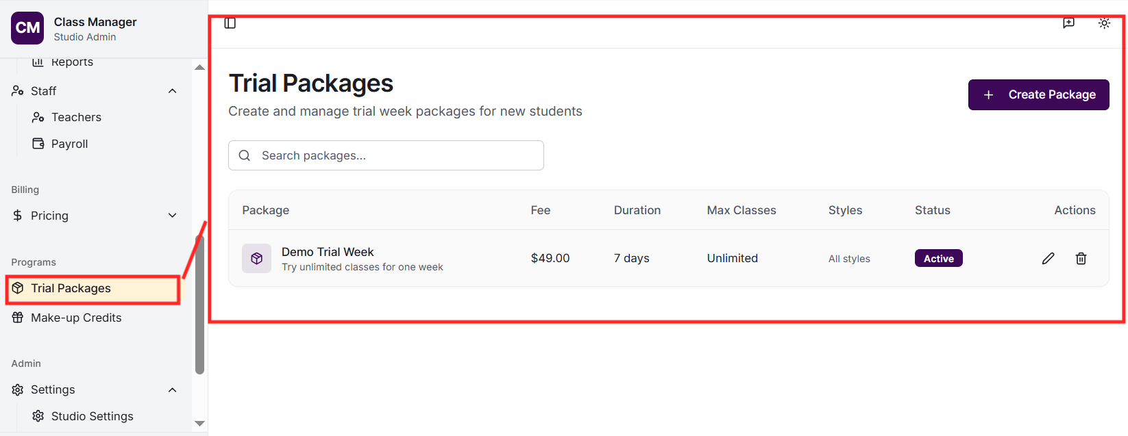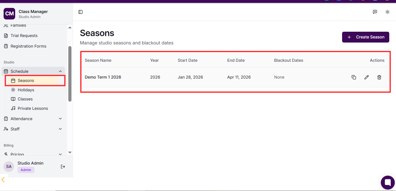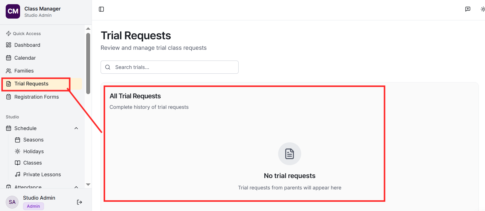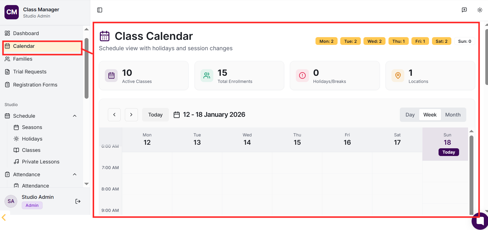 Your studio was created when you first accessed Class Manager. To configure your studio settings, go to Settings in the sidebar. Here you can update your studio name, configure My Studio Manager (MSM) integration settings, set up payment processing (Stripe or Worldpay), and customise parent portal features.