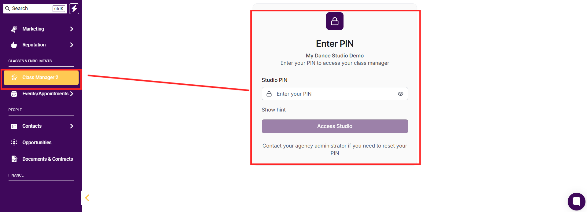 Class Manager uses a secure two-stage authentication: First, our login uses your studio's Location ID and PIN to access your studio from inside My Studio Manager. Teachers have a separate PIN for teacher portal access.
