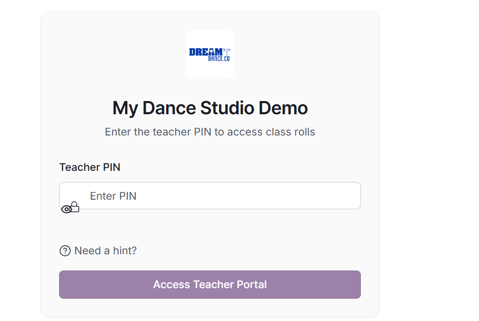 Teachers access the teacher portal using their studio's teacher PIN, then log in with their credentials. They see today's classes and can tap each class to open the roll. For each student, they tap to mark as Present (green), Late (yellow), Absent (red), or Excused (blue). Changes save automatically.