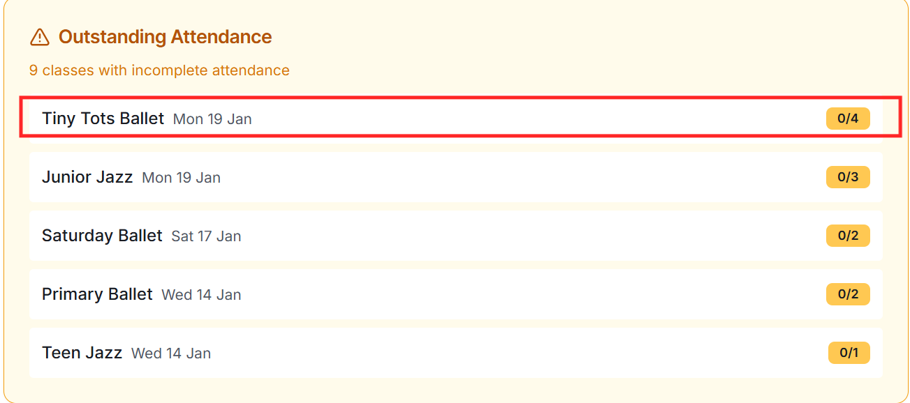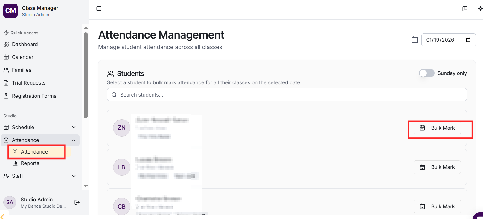 Yes! In the admin portal, go to Attendance, select a date, and choose a student. You can then mark all their classes for that day with a single action - perfect for students who were absent the entire day due to illness or holiday.