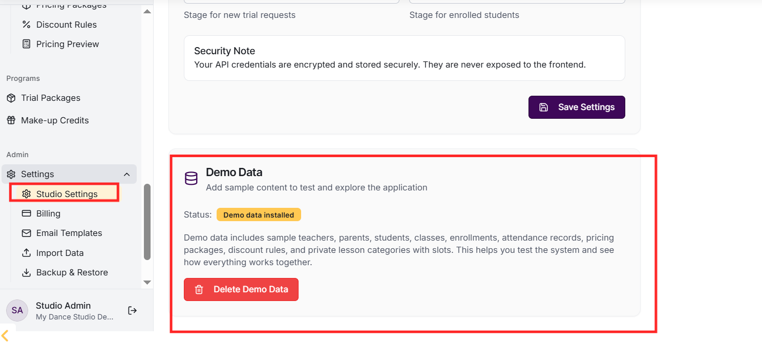 Go to Settings and integrations, scroll to the Demo Data section. Click 'Apply Demo Data' and confirm. Sample content will be created including 3 teachers, 5 parents, 10 students, and 10 classes with enrolments across different styles and age groups.