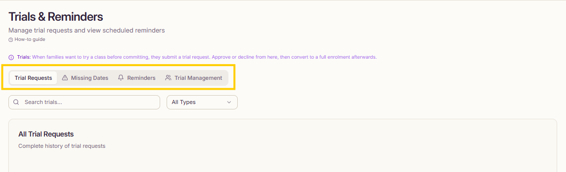 Pending Trials – Students who are scheduled for a trial class but have not yet enrolled.