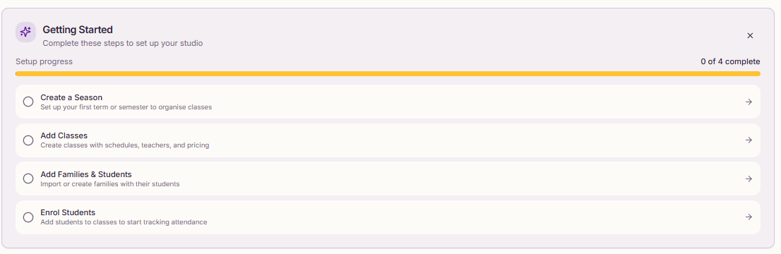 Use this guide to complete the initial setup of your studio in My Studio Manager. Following these steps will help you get your studio ready to manage classes, students, and attendance efficiently.
