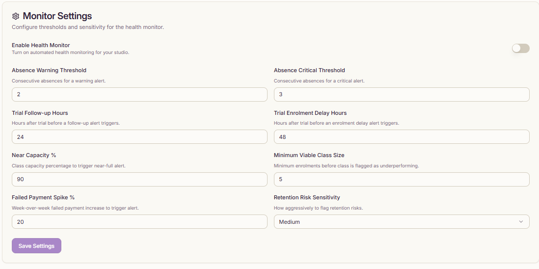 The Studio Health Monitor helps you keep track of critical studio metrics and identify areas that may need attention. It provides a quick view of what matters most for your studio and includes two main pages: