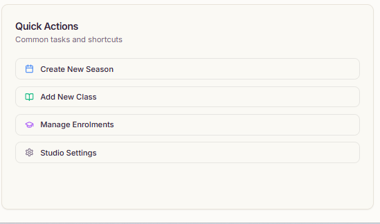 The Quick Actions section provides shortcuts to the most commonly used tasks in My Studio Manager, helping you save time and navigate the platform efficiently.